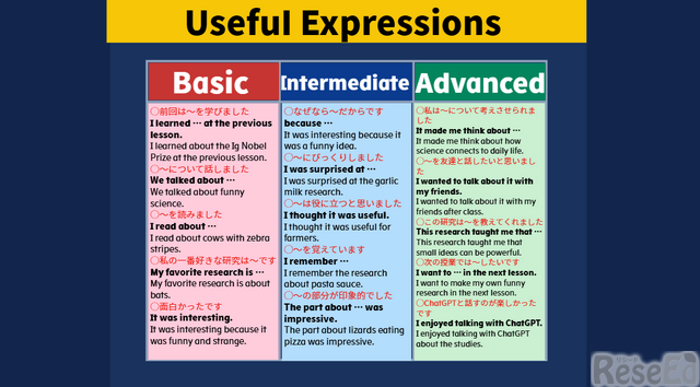 堀教諭:レベル設定が柔軟にできる点が重要なポイントだと思います。授業では、生成AIのプロンプトや参考となる表現をまとめた資料などを示す際、「Basic(初級)」「Intermediate(中級)」「Advanced(上級)」と3つのレベルを用意し、生徒が選んで取り組めるようにしています。自分でレベルを選ぶことにより「これならできる」「ここに挑戦したい」と、主体的に学びに向きあうことができます。ロイロノートを使えば、レベル別のカードを配るのも一瞬です。