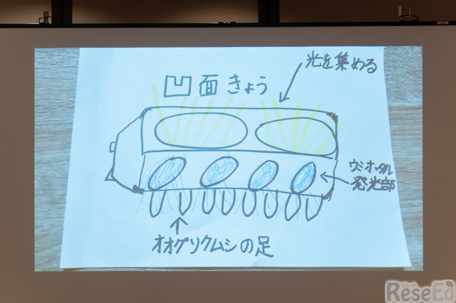 小学5年生の藤本陽南さんは、深海生物の特性を応用した支援技術のアイデアを発表した。深海という、暗く音のない環境で生きる生物たちは、人間にはない優れた感覚や能力をもっている。「その環境は、視覚や聴覚に制約のある人々の状況とも重なるのではないか」という気付きから、深海生物の機能をヒントにした新たな支援技術の可能性を探る提案となった。