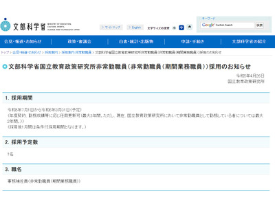 文部科学省は2023年4月26日、国立教育政策研究所の非常勤職員1名の採用について発表した。職務内容は、総務部会計課で行う事務の補助業務。採用期間は2023年7月1日~2024年3月31日(予定)。応募はメールまたは郵送にて、5月29日必着分まで受け付ける。