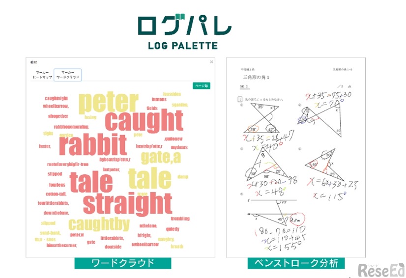児童生徒が引いたマーカー上の単語について着目頻度を大きさに反映したワードクラウド(左)、児童生徒の筆跡をあとから再現する手書き(ペンストローク)分析(右)